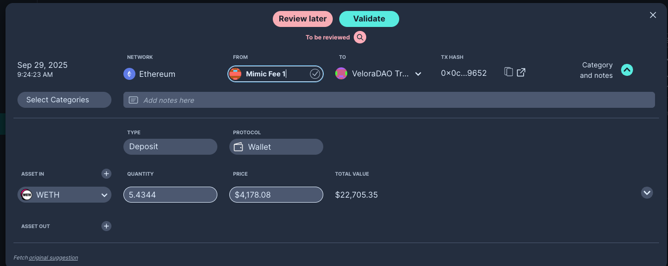Octav to finalize the treasury tracking setup for Velora DAO.